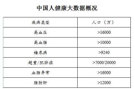 在总人口为13亿多的中国人中,中国高血压人口有1.6~1.7亿人,高血脂的有将1亿多人,糖尿病患者达到9240万人,超重或者肥胖症7000万~2亿人,血脂异常的1.6亿人,脂肪肝患者约1.2亿人。有研究数据显示:平均每30秒就有一个人罹患癌症,平均每30秒就有一个人罹患糖尿病,平均每30秒,至少有一个人死于心脑血管疾病。