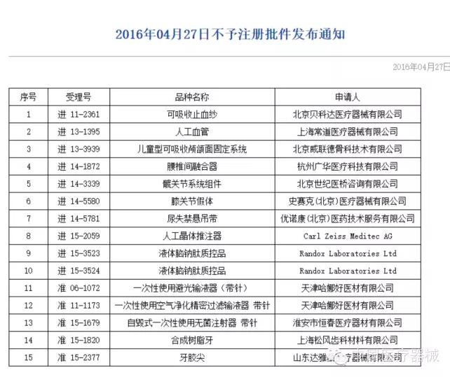 CFDA发布15个不予注册批件、52个变更批件、9个注