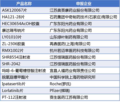 3月首次在我国提出临床申请的1类化学新药有14个,较前一个月增加了3个。江苏恒瑞制药和广东东阳光药业本月均有2个1类新药进入注册程序,江苏奥赛康药业和杭州若迈幸科技有限公司新加入1类新药研发阵营,完成了自家首个一类新药的申报(表1)。