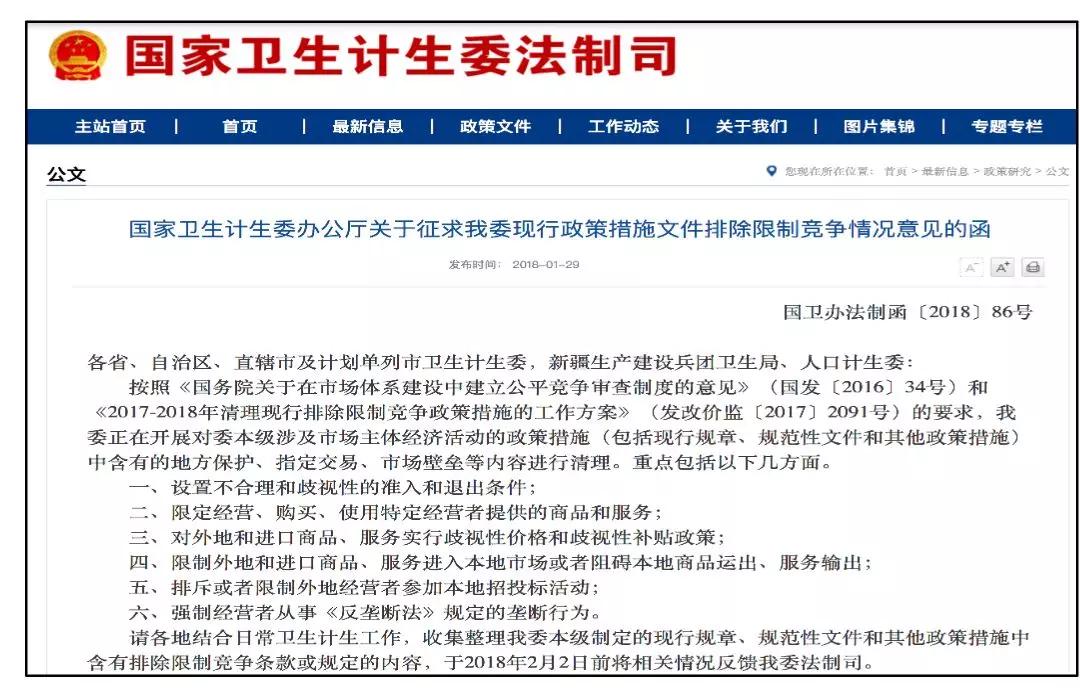 国务院发文,即《国务院关于在市场体系建设中建立公平竞争审查制度的意见》(截图三);国家发展改革委、财政部、商务部等部门联合制定工作方案,即《2017-2018年清理现行排除限制竞争政策措施的工作方案》(截图二);国家卫计委正式发函开始行动,1月29日,国家卫计委网站上发布了“国卫办法制函〔2018〕86号”即《国家卫生计生委办公厅关于征求我委现行政策措施文件排除限制竞争情况意见的函》(截图一)。