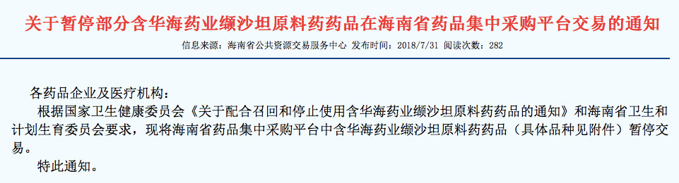 7月31日,海南省公共资源交易服务中心发布通知,将海南省药品集中采购平台中含华海药业缬沙坦原料药药品暂停交易。
